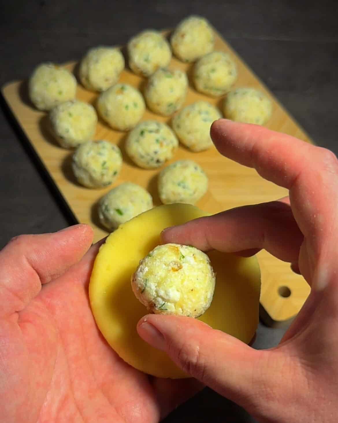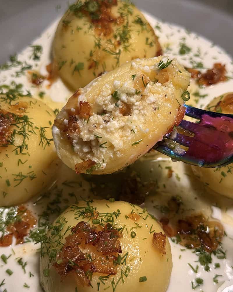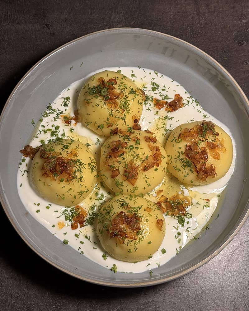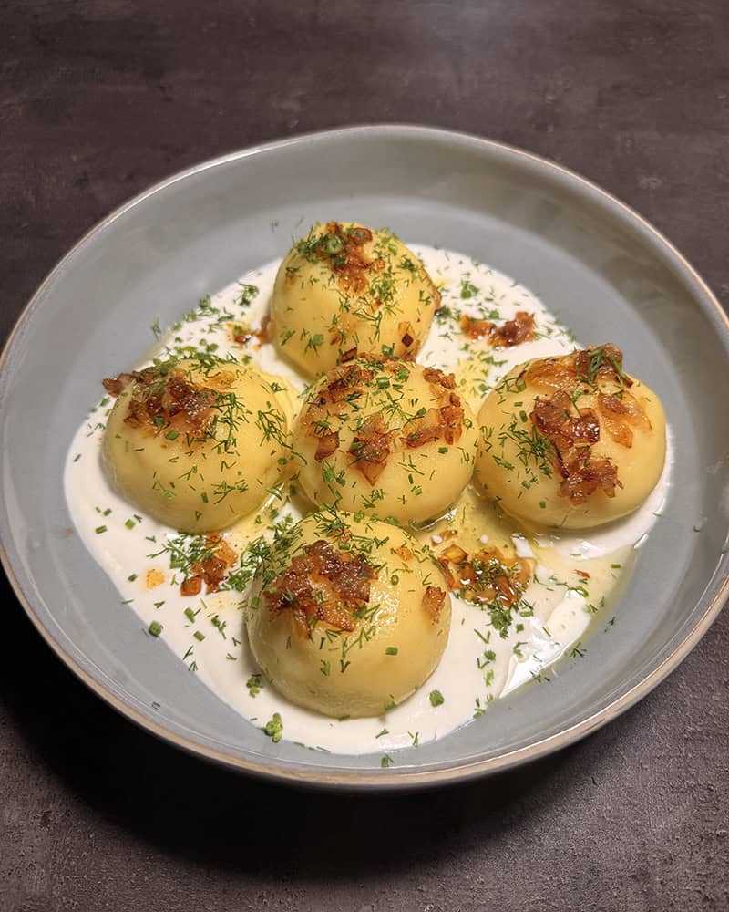 Proces jest prosty i logiczny: gotowane ziemniaki przeciskam przez praskę, część zamieniam w delikatne ciasto z dodatkiem skrobi i żółtek, z reszty robię kremowy, pieprzny farsz z twarogiem, złocistą cebulką i ziołami. Formuję kulki, szczelnie zamykam nadzienie w ziemniaczanym cieście i gotuję do momentu, aż wypłyną – a potem jeszcze chwilę, żeby miały idealną strukturę. Podane ze śmietaną i okrasą smakują jak pierogi ruskie na dopalaczu.