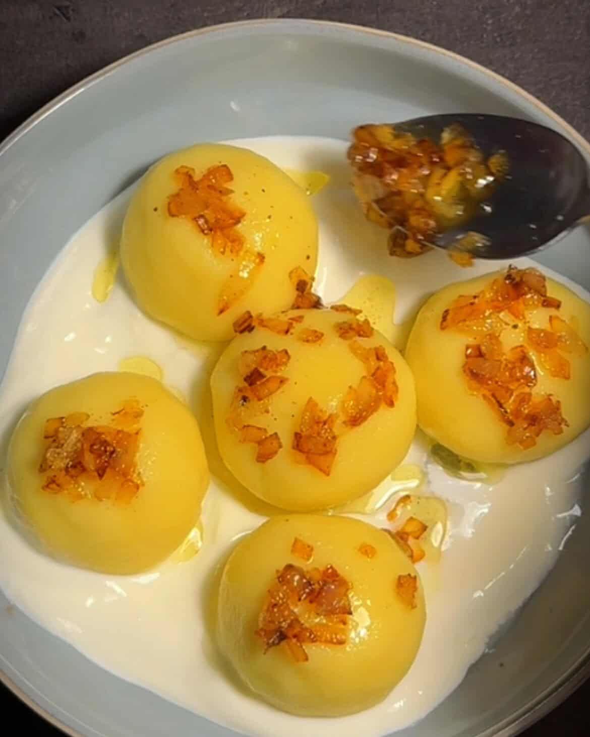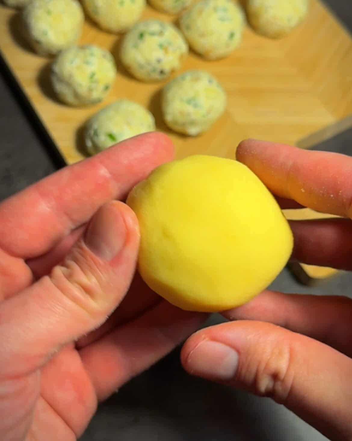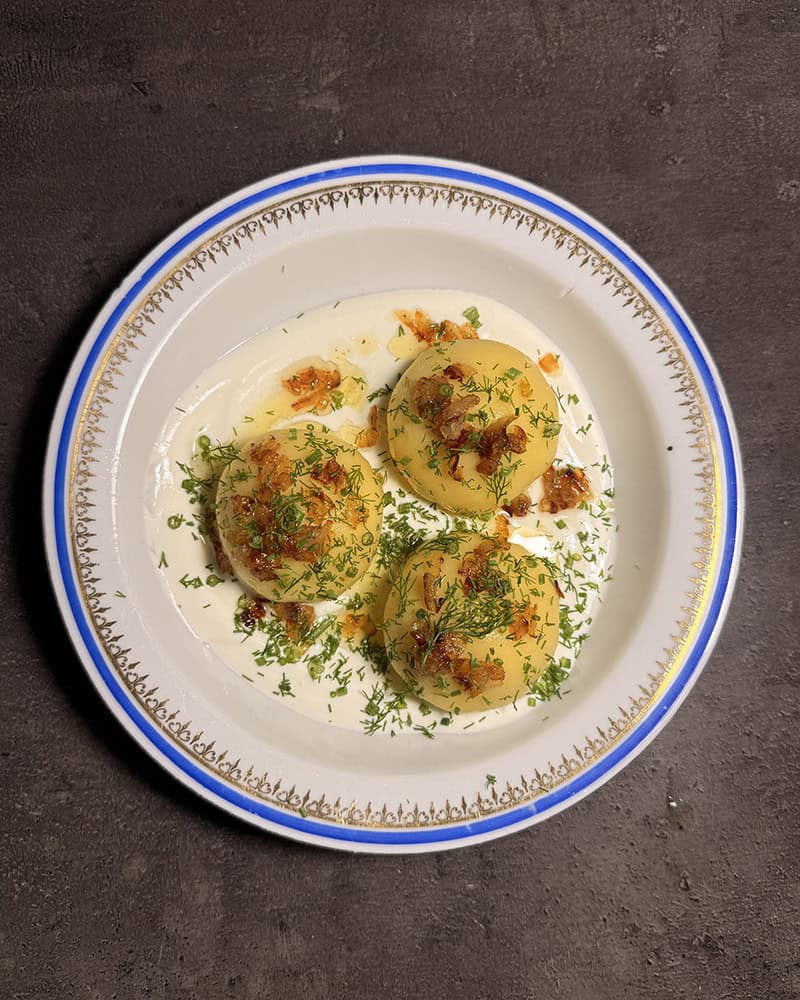 Proces jest prosty i logiczny: gotowane ziemniaki przeciskam przez praskę, część zamieniam w delikatne ciasto z dodatkiem skrobi i żółtek, z reszty robię kremowy, pieprzny farsz z twarogiem, złocistą cebulką i ziołami. Formuję kulki, szczelnie zamykam nadzienie w ziemniaczanym cieście i gotuję do momentu, aż wypłyną – a potem jeszcze chwilę, żeby miały idealną strukturę. Podane ze śmietaną i okrasą smakują jak pierogi ruskie na dopalaczu.
