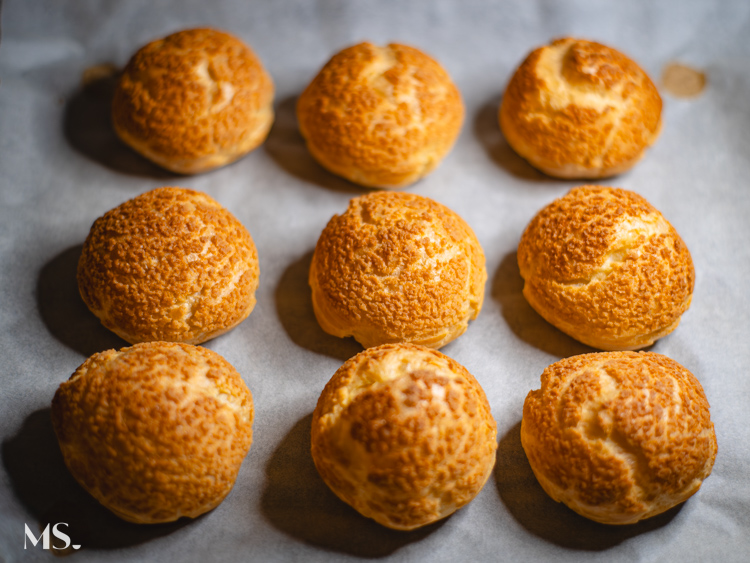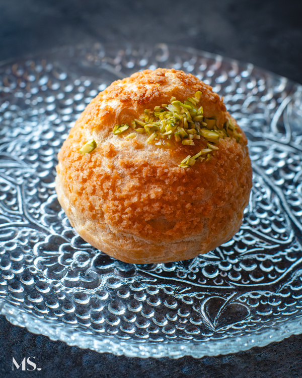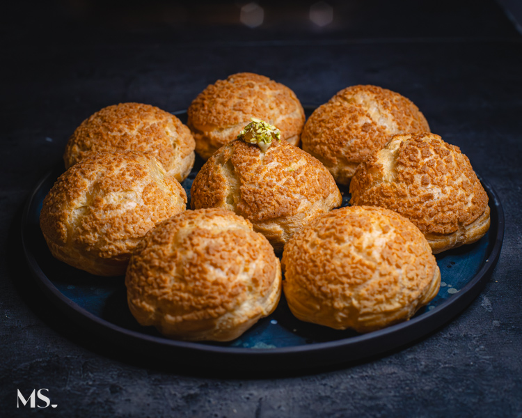 W tradycji francuskiej ciasto parzone to fundament słodkich i wyrafinowanych deserów, od eklerek po profiterole (miniptysie), ale to właśnie ptyś z kremem zyskał w moim sercu szczególne miejsce. Krem pistacjowy diplomat, którym wypełniamy te ptysie, różni się od klasycznych kremów budyniowych tym, że łączy strukturę gęstego budyniu z delikatnością bitej śmietanki — lekkość, którą daje ubita kremówka, równoważy pełnię smaku żółtek i wanilii. Dzięki temu krem diplomat jest bardziej jedwabisty, mniej ciężki niż tradycyjny krem budyniowy (crème pâtissière), a jednocześnie stabilny i idealny do nadziewania.
